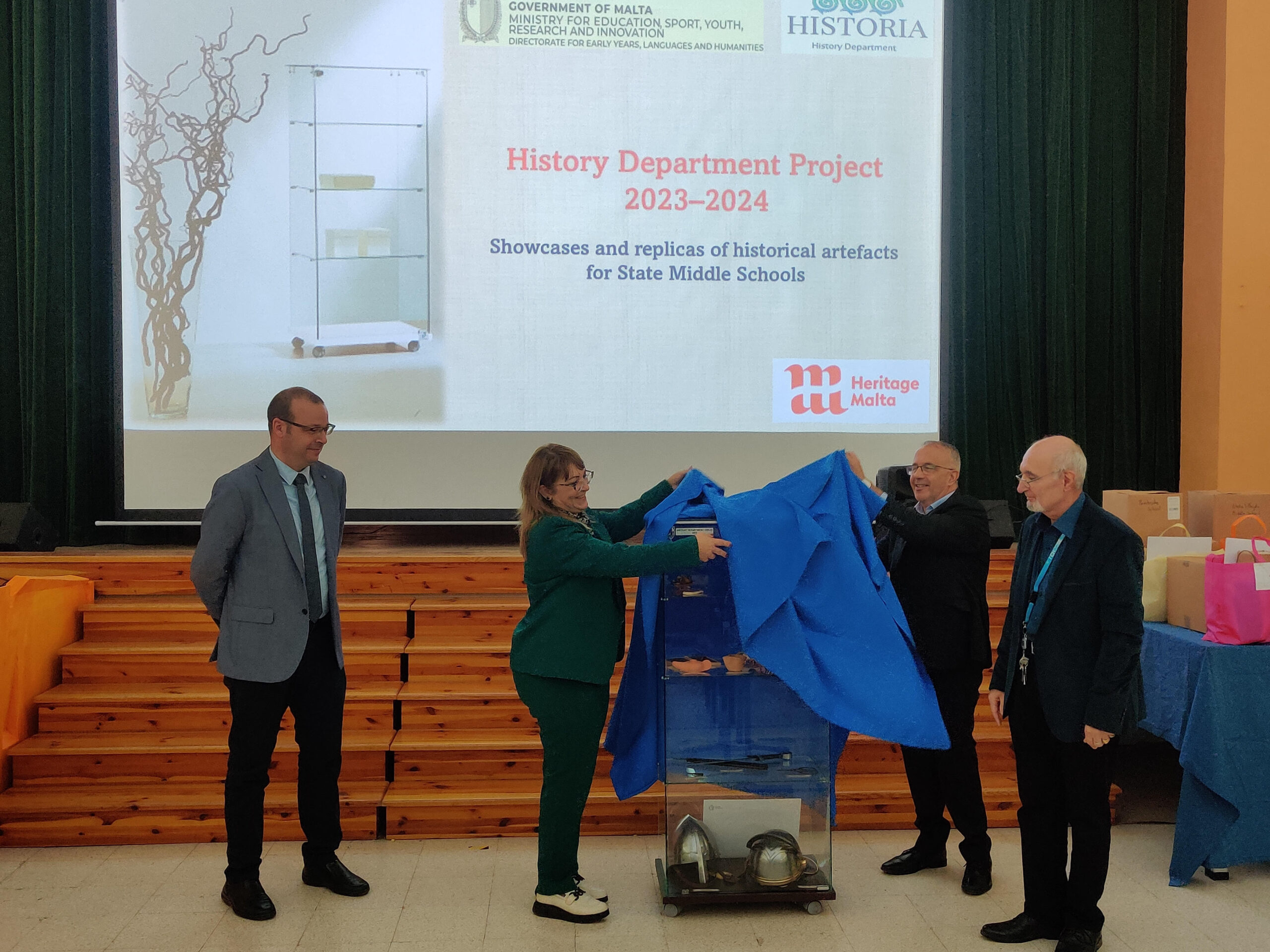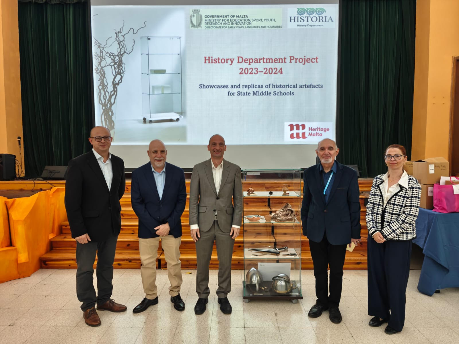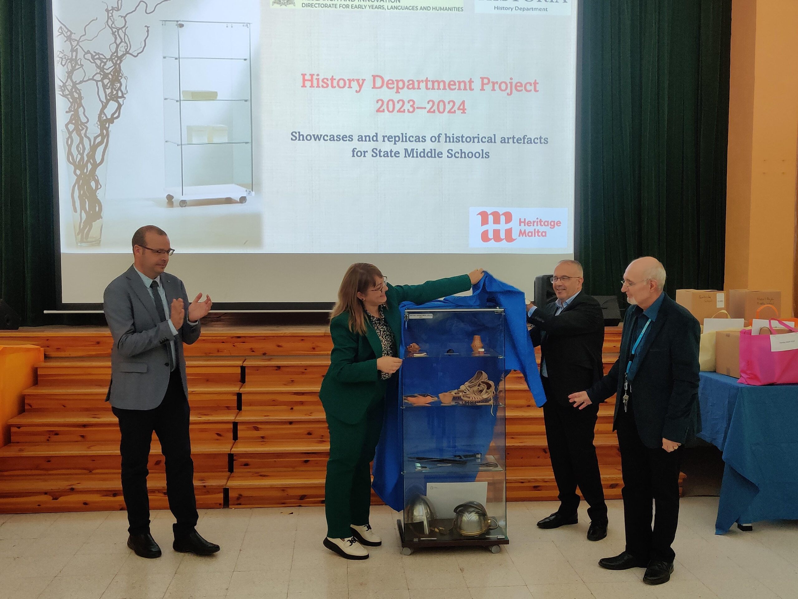 On Tuesday 19 November 2024, a ceremony was held at the Hall of St Thomas More College Carlo Diacono Middle and Secondary School, in which a showcase with historical artefacts was unveiled for use in State Middle Schools. A total of 13 showcases have been given to the State Middle School by the History Department within the DELH which will host several replicas of historical artifacts from pre-history to the Middle Ages. This was done so that the students, while observing and handling such artefacts, could reach conclusions about the people and the time when similar artefacts were used.